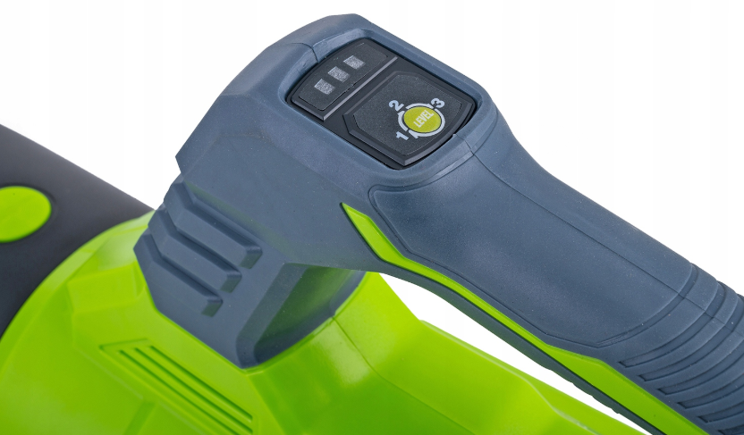 Dmuchawa została wyposażona w diodowy wskaźniku stanu akumulatora, dzięki temu wiemy podczas pracy ile baterii jeszcze pozostało do wyczerpania.