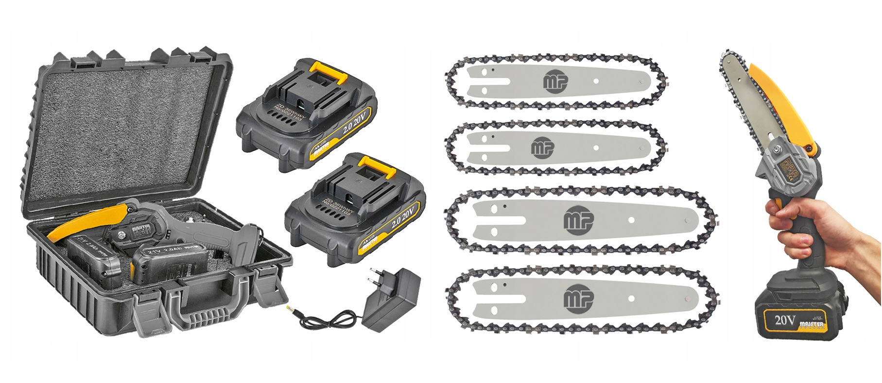 Piła łańcuchowa akumulatorowa pilarka 2x AKU 4 łańcuchy 4 prowadnice