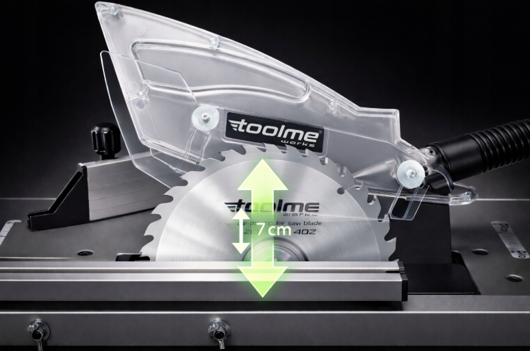 - Regulacja wysokości cięcia Max 7cm Piła stołowa oferuje precyzyjną regulację głębokości cięcia, która – podobnie jak regulacja kąta nachylenia tarczy – realizowana jest za pomocą tego samego ergonomicznego koła sterującego