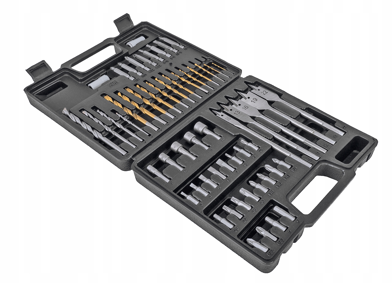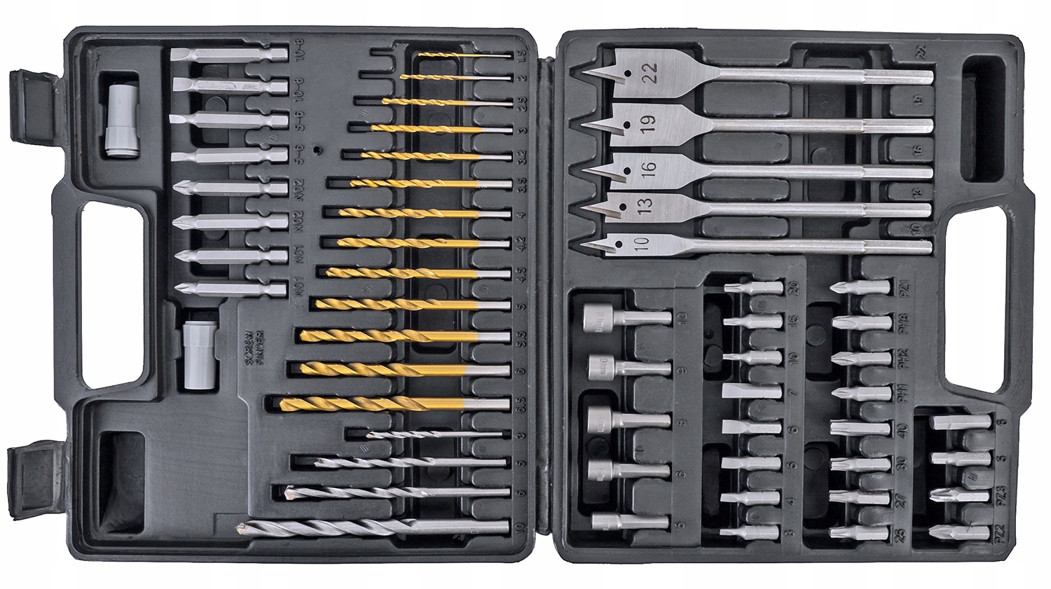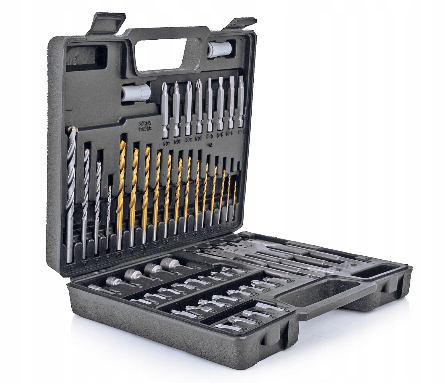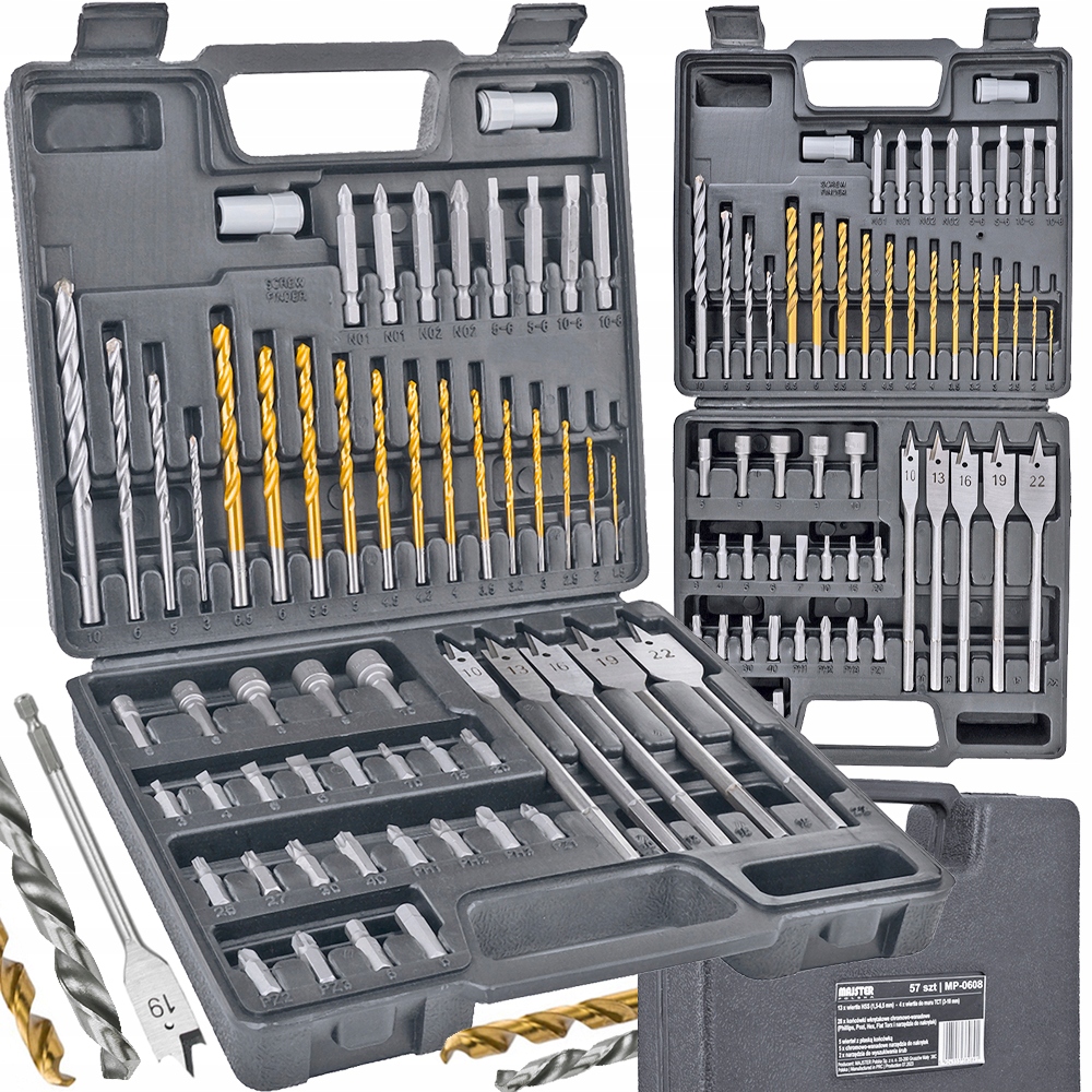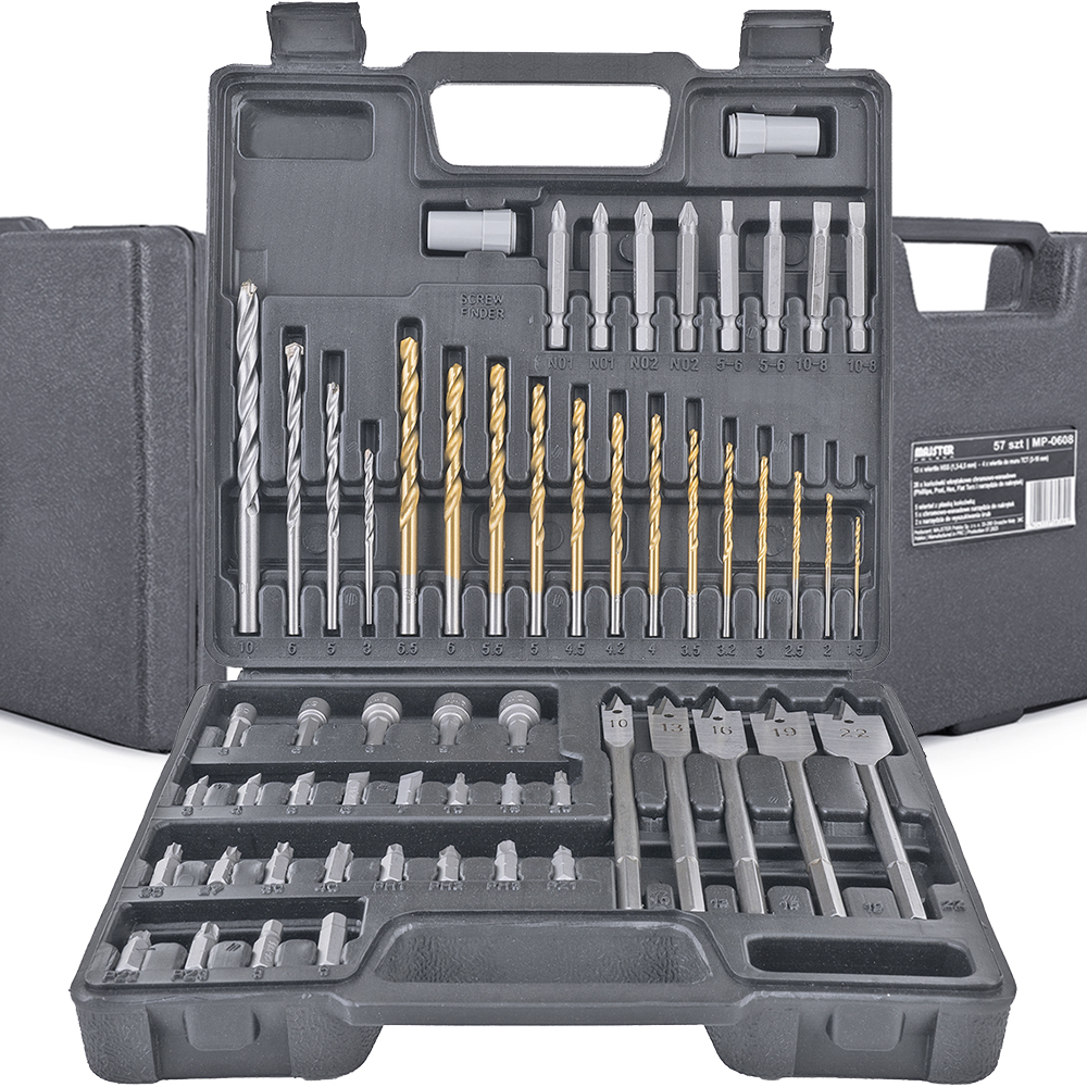 - Zestaw wierteł i bitów 57 elementów wykonanych z wysokiej jakości materiałów w opakowaniu z mocnego tworzywa sztucznego.