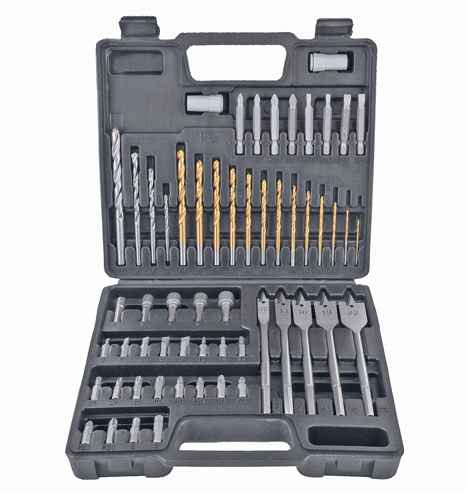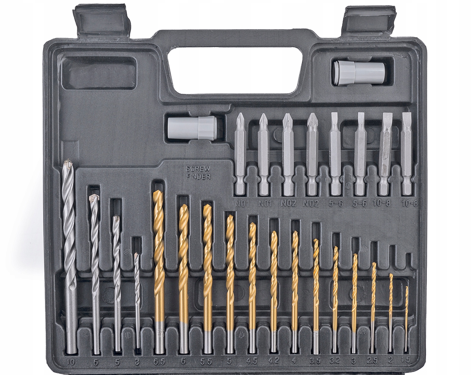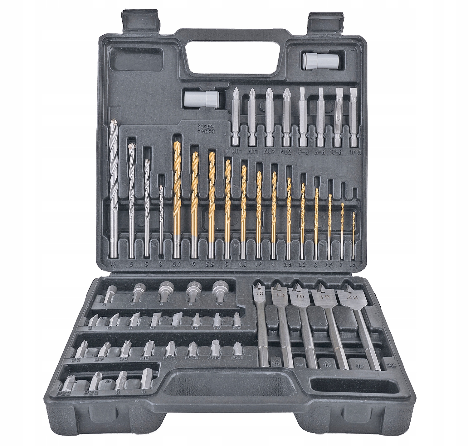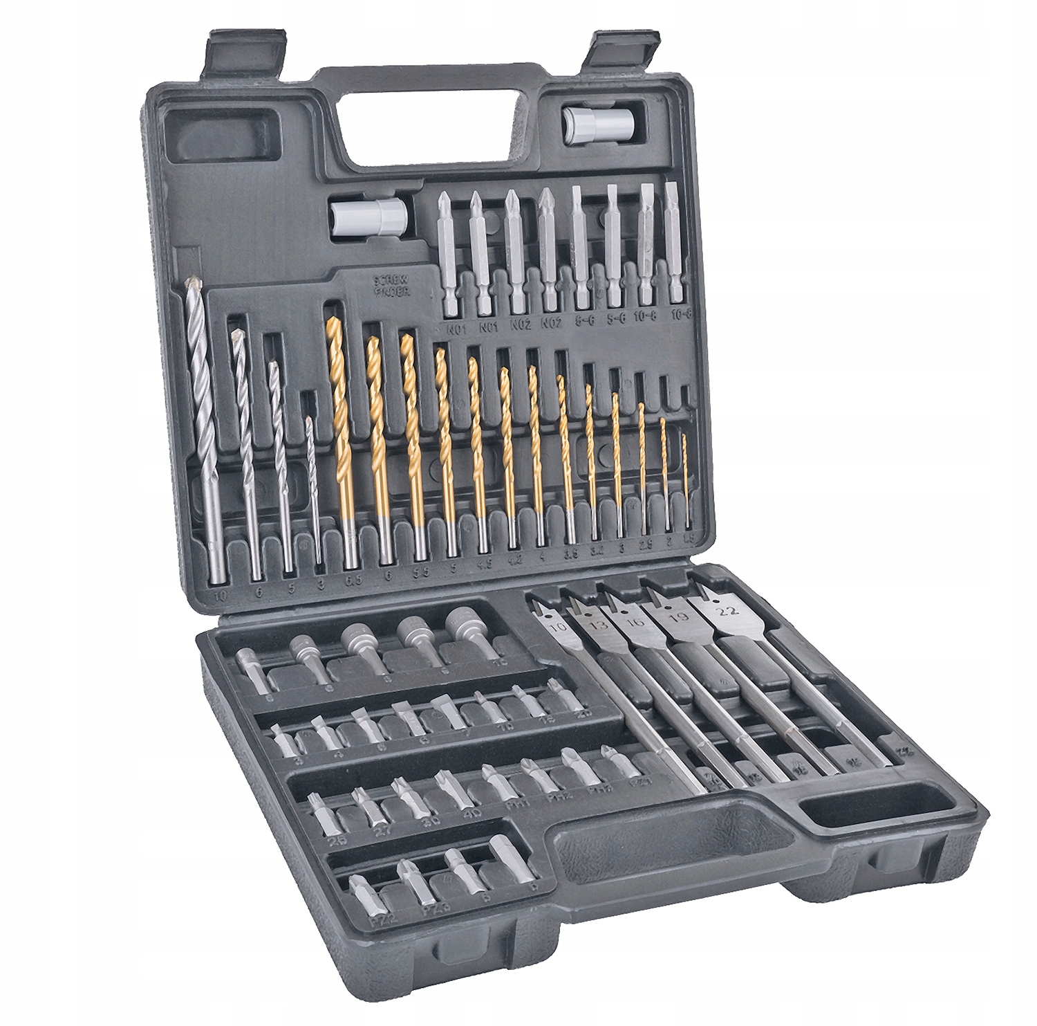 - Zestaw wierteł i bitów 57 elementów wykonanych z wysokiej jakości materiałów w opakowaniu z mocnego tworzywa sztucznego.