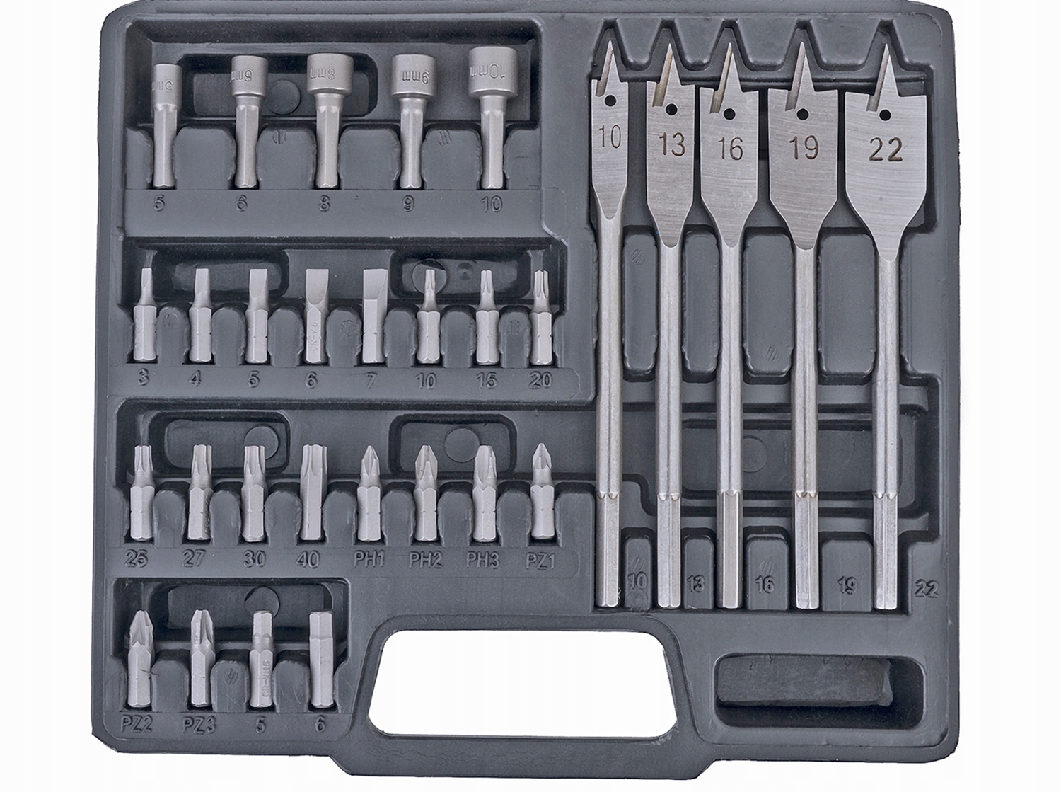 - 5 wierteł łopatkowych do drewna (10 – 13 – 16 – 19 – 22 mm),